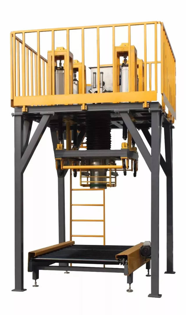 固定在稱重平臺上。具體包括二只氣動升/降機構、四只導向機構等。根據實際充填狀況,可將稱量中的料袋在某個時點上下升降數次,以保證的填充效果。另一方面,當稱重完畢時,將重袋下降至地面或地面的托盤上,亦即將料袋的上部懸掛狀態轉變為袋底的托起狀態,從而便于自動松開袋口、吊帶自動脫鉤等工序的執行。