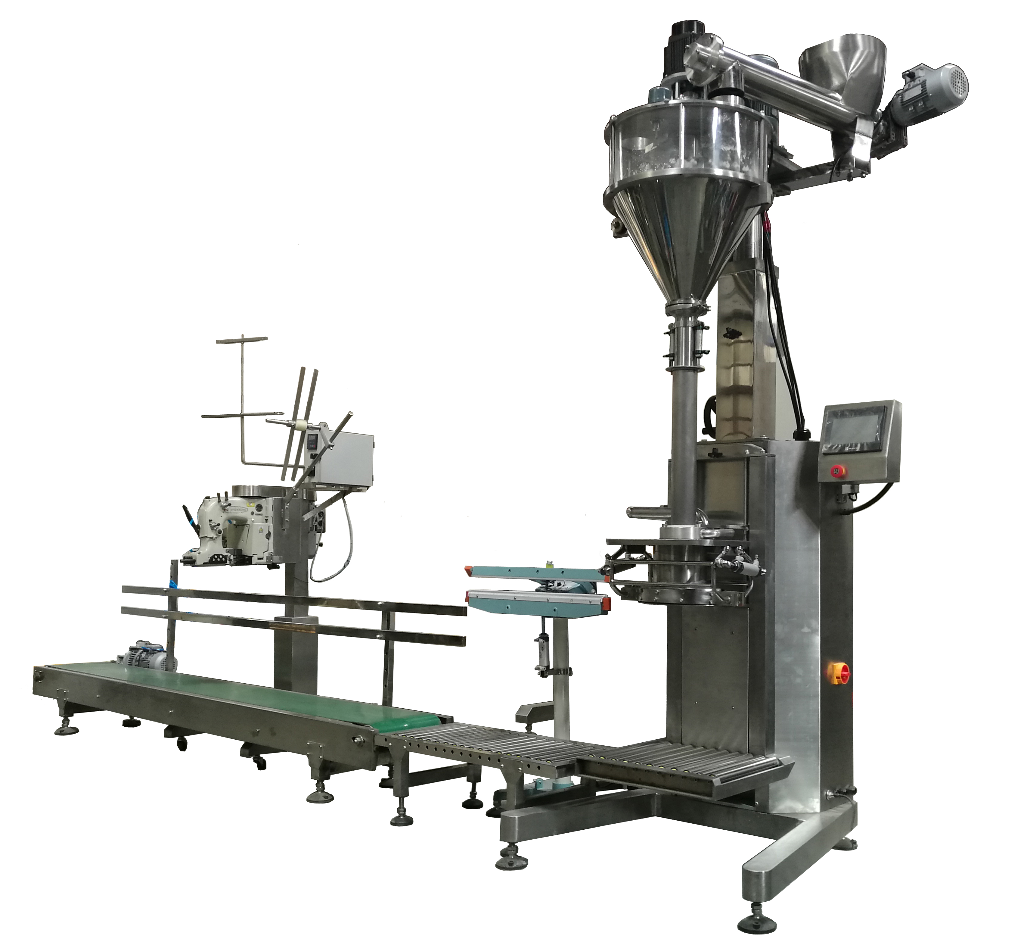 該機主要工作流程為設定好包裝重量后,人工將包裝袋套到氣動夾袋機構,啟動灌裝開始按鈕,夾袋機構自動將袋子夾住,然后往包裝袋中進行放料,放料過程分為粗加料和精加料兩個階段,且加料過程中可選配除塵及抽真空工藝。達到標定重量后,夾袋機構自動脫開,人工將包裝袋搬至皮帶輸送機上進行抽氣、封口等工序。